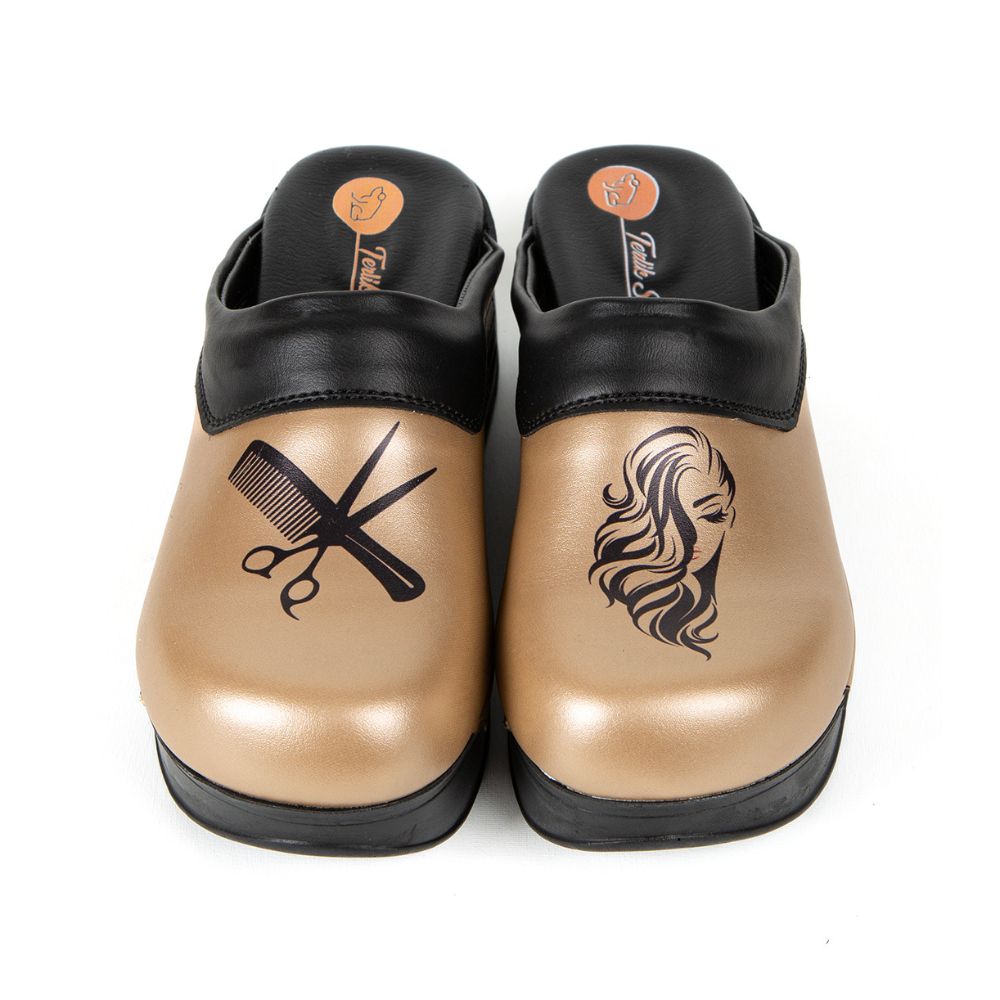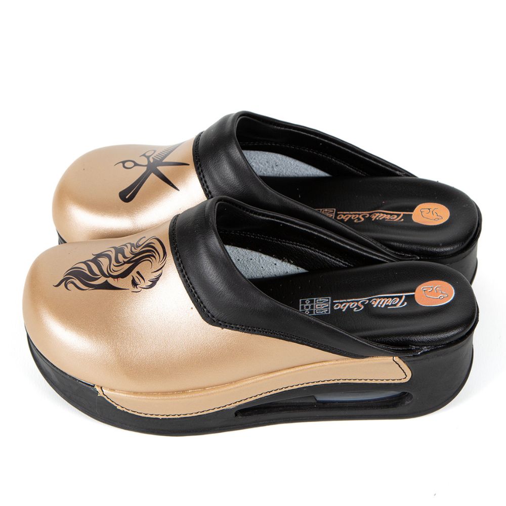 Anatomske klompe Frizerka Zlatne idealne su za žene koje provode sate na nogama. Izrađene od antibakterijske kože i ekološkog poliuretana, nude masažni uložak, protuklizni potplat i moderan zlatni dizajn. Praktične klompe za frizerke koje spajaju udobnost i stil, sada s masažnim uloškom za svaki udoban dan!